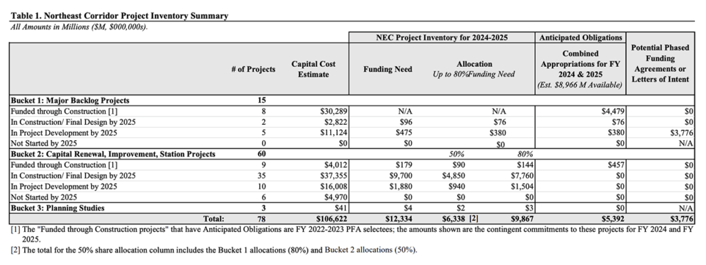 On Nov. 15, 2022, FRA released the first NEC Project Inventory, which was required no later than one year after enactment of the Infrastructure Investment and Jobs Act (also known as the Bipartisan Infrastructure Law/BIL) and which must be updated every two years. It informed the FY 2022-23 FSP-NEC Notice of Funding Opportunity and the 25 project selections announced last fall that received a total of $16.4 billion; Amtrak received nearly $10 billion for the 12 projects it is leading.