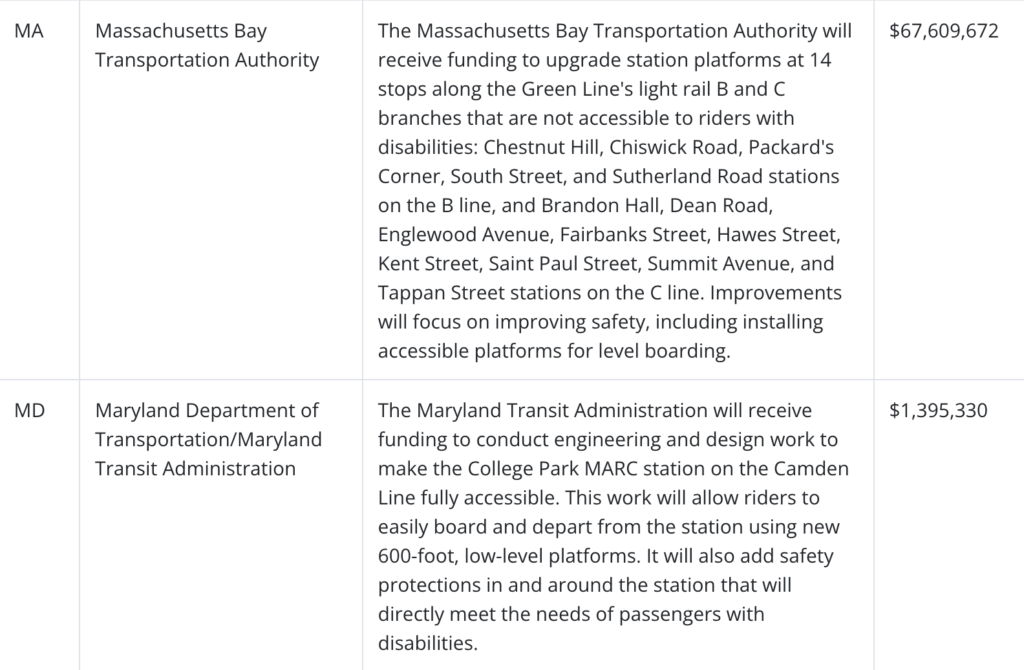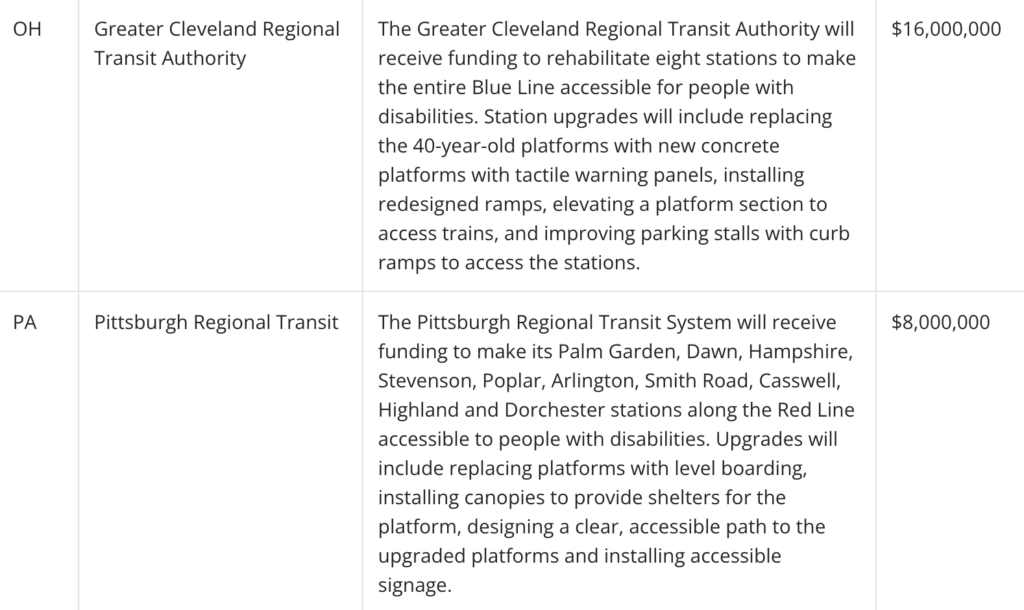 “Since the passage of the Americans with Disabilities Act, great strides have been made in improving accessibility, but there is still a lot of work to accomplish,” FTA Acting Administrator Veronica Vanterpool said. “By modernizing rail systems across the country, the ASAP program provides funding to address these overdue improvements. We want to ensure that all customers can use transit systems with ease and reliability, including people with disabilities, those using mobility devices, and other users needing more accessible spaces.”