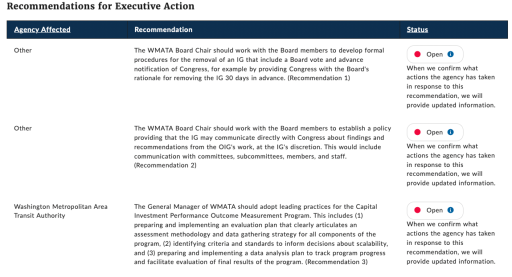 WMATA’s Office of Inspector General (OIG) is supposed to provide independent oversight of its operations, but GAO says it has found some threats to that independence. For example, WMATA’s Board doesn’t have procedures to remove an IG—meaning an IG could be terminated for any reason. This, GAO says, may lead IGs to “fear reprisal for issuing reports that are critical of the agency.”