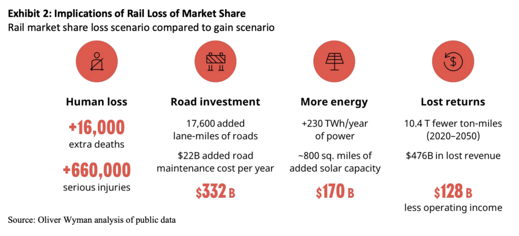 To put context around what a continued loss of rail market share could mean for our society as well as rail stakeholders, I would like to summarize an analysis that Oliver Wyman performed in 2022, in which we looked at the implications of several scenarios for rail market share through 2050. These are shown in Exhibit 1.