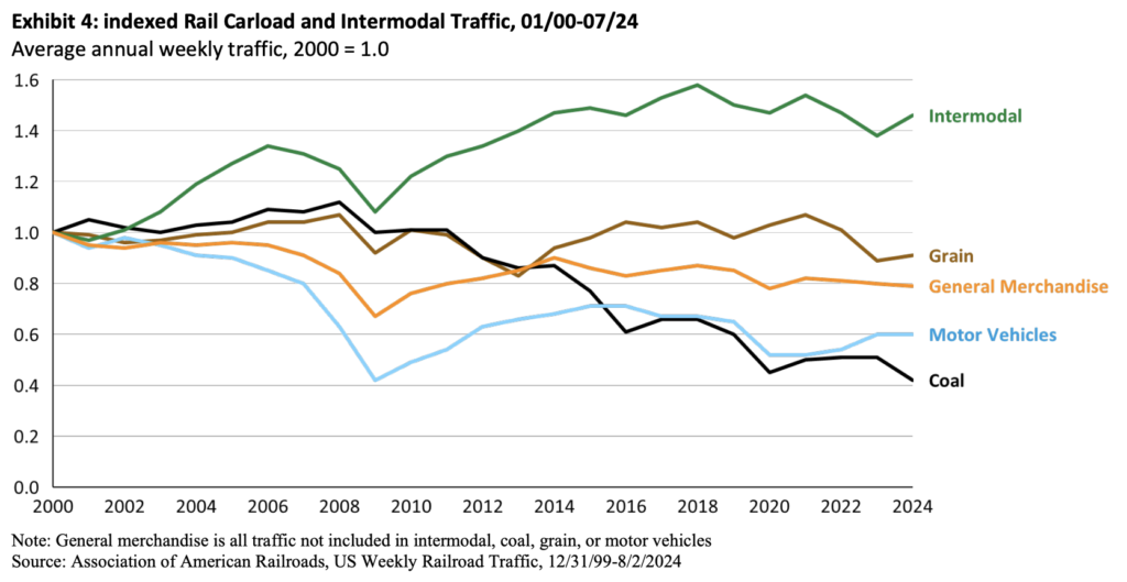 It is tempting to attribute the railroads’ market share loss exclusively to the decline of coal, but as shown in Exhibit 4, except for intermodal, major non-coal sectors of rail freight also have not been growing. Truck ton-miles, on the other hand, have grown steadily by 1.4 percent a year since 2000.