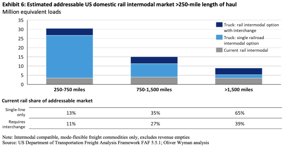 In addition, some lanes over 750 miles that are now served by truck could be made more accessible to rail in the future by adding smaller, more flexible terminals closer to demand. Railroads also have noticeably lower share of intermodal when there is more than one railroad involved, so streamlining interchanges to match single-railroad levels of service could add more volume to the existing network as well.