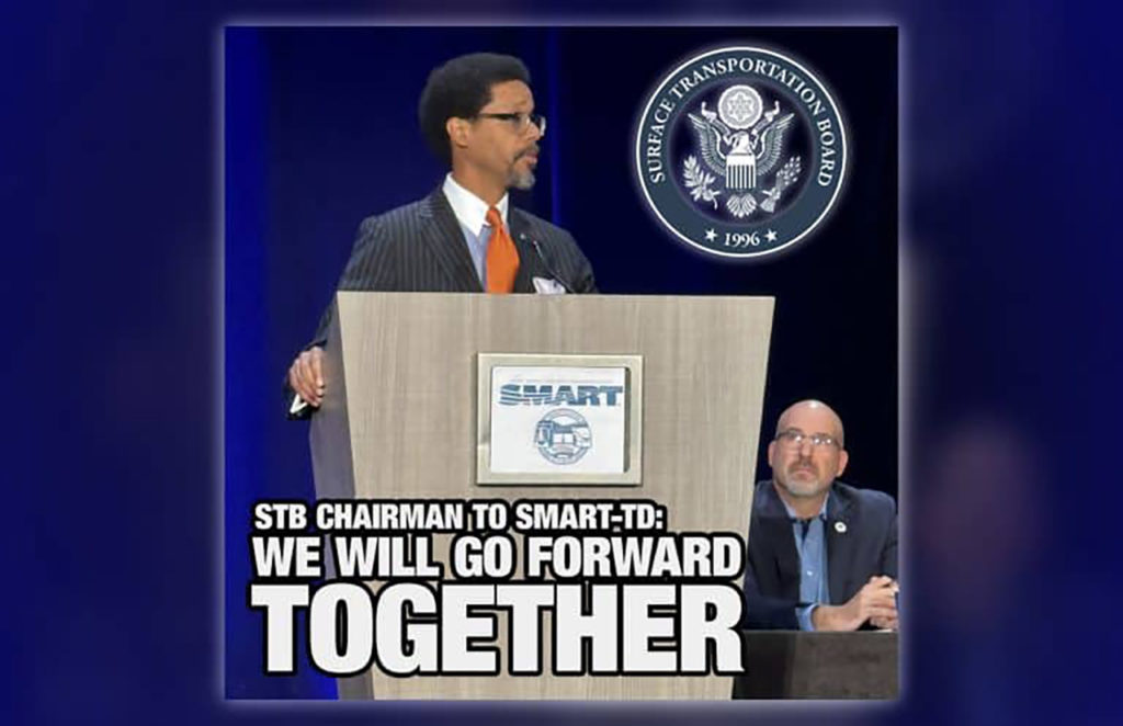 STB Chairperson Robert Primus (and Vice Chair Karen Hedlund) opened the second day of the SMART-TD National Training Seminar on Wednesday, July 10. “Organizations like SMART-TD brought service issues, massive layoffs and quality-of-life issues including draconian attendance policies and the lack of paid sick leave to light,” SMART-TD reported Primus as saying. “All the corporate types, they all started waking up, and we were able to really start to move the needle on some of these issues. What Marty [Oberman] started has brought a powerful partnership between STB and labor. The result is, we’re stronger moving forward. That’s the big thing. All the things that they were doing in the dark were brought into the light. The good news is we’re going to be going forward together.” SMART-TD graphic.