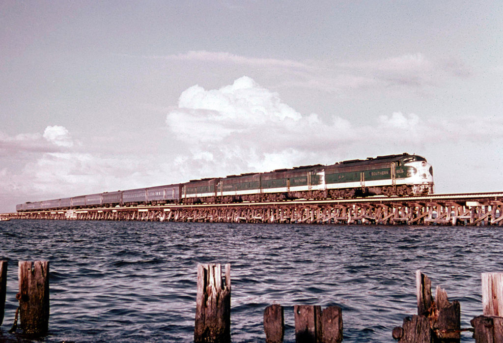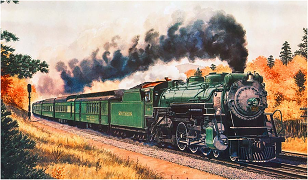 Good grief, this can’t be so. The Crescent was Norfolk Southern predecessor Southern Railway’s showcase passenger train when introduced in 1925 as the Crescent Limited—its livery (including motive power) two shades of polished Virginia Green, with gold lettering. Legendary railroad artist Howard L. Fogg immortalized the Crescent in an oil painting.