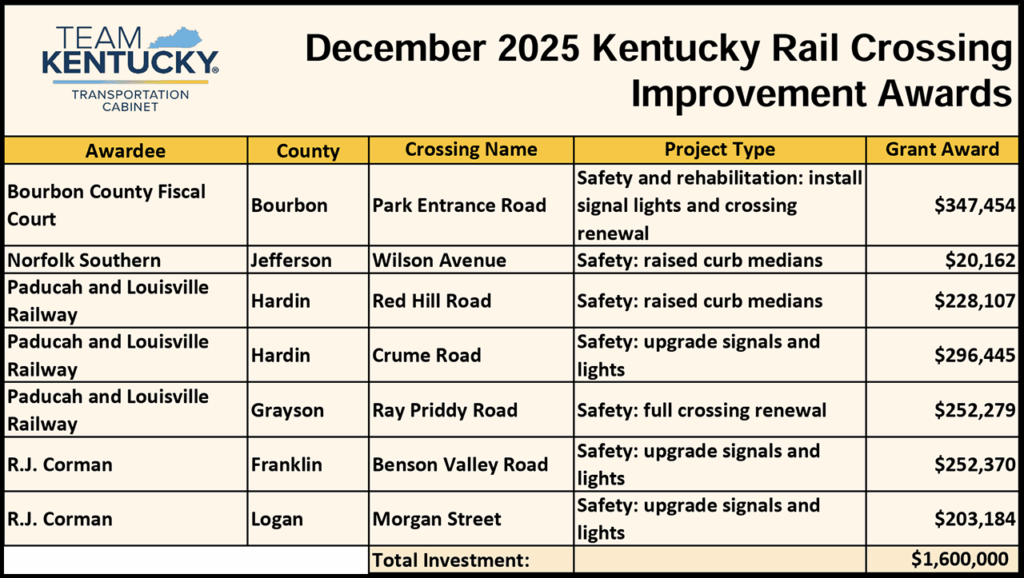 The funding is from the Kentucky Rail Crossing Improvement (KRCI) program “to improve safety and traffic flow at public rail crossings by adding or upgrading warning devices,” and from the Kentucky Industrial Access and Safety Improvements (KIASI) program to “strengthen rail connectivity, improve service to existing industries, enhance on-time performance, and support economic development and new investment,” grant administrator Kentucky Transportation Cabinet reported Jan. 8.