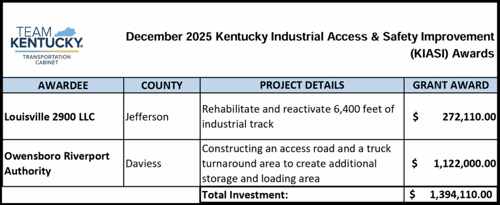 The two KIASI projects, totaling nearly $1.4 million, will rehabilitate and reactivate 6,400 feet of track in Jefferson County for Louisville 2900 LLC; and will pave 26,500 square feet of asphalt for an access road, and pour 41,700 square feet of concrete for an area designated for storage and for loading and unloading railcars in Daviess County for the Owensboro Riverport Authority.