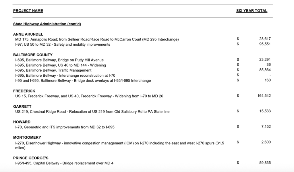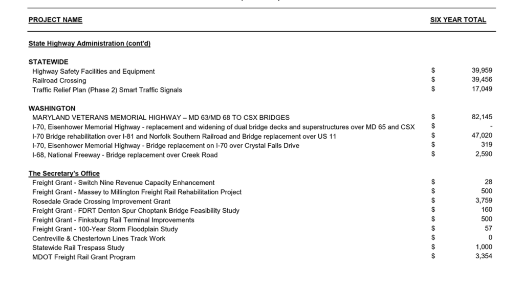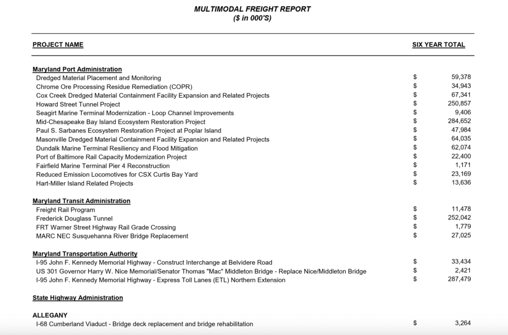 The list below highlights projects that MDOT said “have significant freight impacts and are funded for planning, design, and construction activities” in the CTP, for approximately $2.3 billion. It also identifies costs for Port projects by marine terminal and costs for highway- and rail freight-related projects in each county.