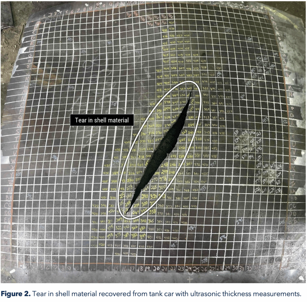 Two other derailed LPG tank cars (UTLX 954193 and NATX 40068) were not mechanically breached during the derailment but released lading from shell tears after being exposed to fire, according to the report. The duration of fire exposure before these releases was not recorded. The Federal Railroad Administration (FRA) recovered the panels of tank car shell material containing tears for examination in coordination with the NTSB. Ultrasonic measurements showed that the shell wall had thinned and cracked near the tears. (See Figure 2, below)