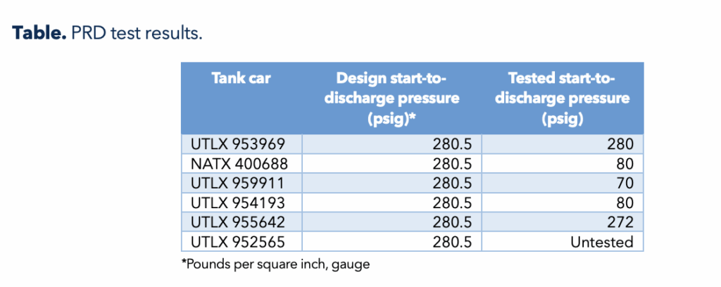According to the report, the NTSB also recovered PRDs from all six derailed DOT-112 tank cars for examination and testing to determine whether they functioned as designed. “Five PRDs were sufficiently intact to test safely; the sixth had sustained thermal damage severe enough that it could not be disassembled or tested. The severely damaged PRD came from a mechanically breached tank car.” Test results are summarized in the table below.