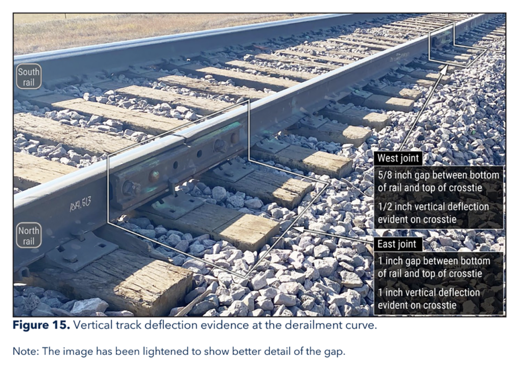 The report also addressed subgrade instability. “On September 15, 2022, NTSB investigators and representatives from BNSF’s engineering department returned to Joplin for additional evaluation of the accident curve, including a walking inspection,” it said. “The NTSB noted that since the derailment, BNSF had conducted extensive track renewal in the curve, in addition to the crosstie and surfacing work that had been done before the derailment. BNSF replaced both the north and south rails with 141-pound CWR, which eliminated all rail joints in the curve, and reinforced some of the crossties. BNSF then surfaced the track after this work to obtain proper track geometry … [T]he NTSB noted a segment of track that exhibited vertical movement and subgrade instability near the earthen fill that contained the culvert that encompassed the POD and extended about 78 feet west and about 200 feet east. This area had been identified because of the disturbed ballast between the crossties that had showed signs of movement. Track always demonstrates some degree of vertical movement. However, during the September 15, 2022, walking inspection, the NTSB noted that while a freight train was traversing the fill, the track was moving more significantly in a vertical direction under the loads put on the track by the train wheels than on the other areas of the track. The NTSB concludes that there was an ongoing unresolved subgrade instability issue on the derailment curve.”