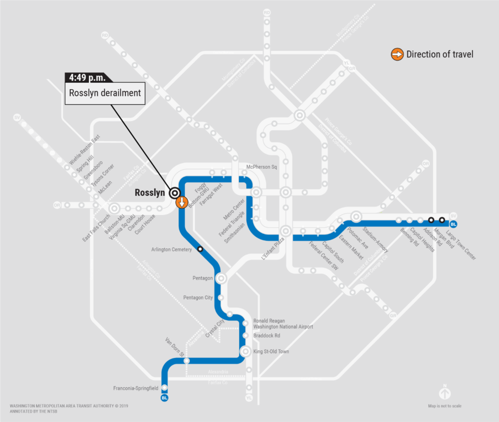 WMATA’s train 407, comprising eight Kawasaki Rail Car-built 7000 series railcars and carrying 187 riders and the operator, derailed Oct. 12, 2021, while traveling from Rosslyn Station toward Arlington Cemetery Station on the Blue Line in Arlington, Va. (see map above). The derailment occurred in a tunnel south of the Rosslyn Station platform. All railcars remained upright and in-line. No injuries were reported; one passenger was transported to the hospital, treated and released.