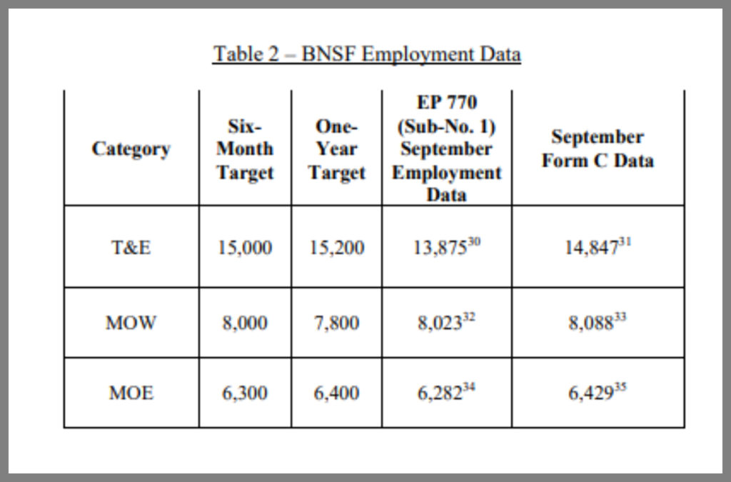 BNSF labor: For its labor force targets, BNSF stated that it expects to employ 15,000 T&E employees at six months (15,200 employees in one year), 8,000 MOW employees at six months (7,800 employees in one year), and 6,300 MOE employees at six months (6,400 employees in one year. However, the STB found that BNSF is far from its T&E target when compared to the September monthly employment data in this docket for employees actively on the job.