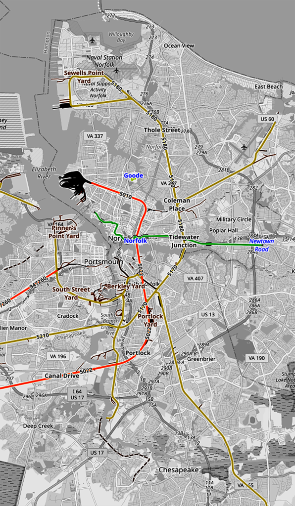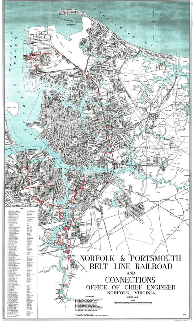 1948 N&PBL (Norfolk & Portsmouth Belt Line Railroad) map showing railroad system and major customers in City of Norfolk, City of Portsmouth, Norfolk County/Incorporated Town of South Norfolk (now Chesapeake), Virginia.