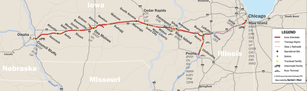 The regional’s attorneys reported that in addition to Council Bluffs and Chicago, IAIS maintains interchange connections with Class I railroads at Des Moines, Iowa City, and Davenport, Iowa, and at Rock Island, Peoria, and Utica, Ill. (see map above). Through a number of interchange points, IAIS has connections with and handles freight traffic in conjunction with all Class I railroads, as well as several short lines and regionals. Of particular significance, they said, IAIS has an interchange arrangement with the Cedar Rapids and Iowa City Railroad (CIC) at Cedar Rapids, Iowa, through which IAIS moves shipments of ethanol, denatured alcohol and agricultural commodities originating on the IANR to Chicago and (via subsequent interchange) to points beyond. IAIS competes with CN for this traffic, they reported, and the “IANR-CIC-IAIS routing provides a number of Iowa shippers with a competitive alternative to an IANR-CN haul. The importance of maintaining this alternative on an effective competitive basis establishes IAIS’s interest in this proceeding.”