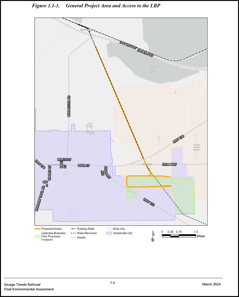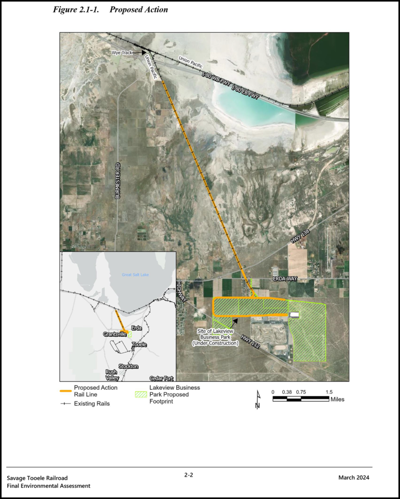 “Construction and operation of the line will give shippers a new freight rail option, which will support business diversification within the Park and more competitive transportation rates,” the STB said in its decision (download below). “With OEA’s final recommended mitigation, there will be no potential for significant environmental impacts; indeed, the line will facilitate the diversion of traffic from truck to rail, thereby increasing overall energy efficiency and reducing emissions from trucks. After carefully considering the transportation merits and environmental issues, the Board, considering the entire record, finds that the petition for exemption to allow STR’s [Savage Tooele Railroad Company’s] construction and operation of the approximately 11-mile line of railroad in Tooele County assessed in the Draft and Final EAs [Environmental Assessments] should be granted, subject to compliance with the environmental mitigation measures in Appendix A.” Mitigation includes general measures, noise, grade crossing safety and delay, biological resources, water resources, hazardous materials, cultural resources, air quality, and climate change.
