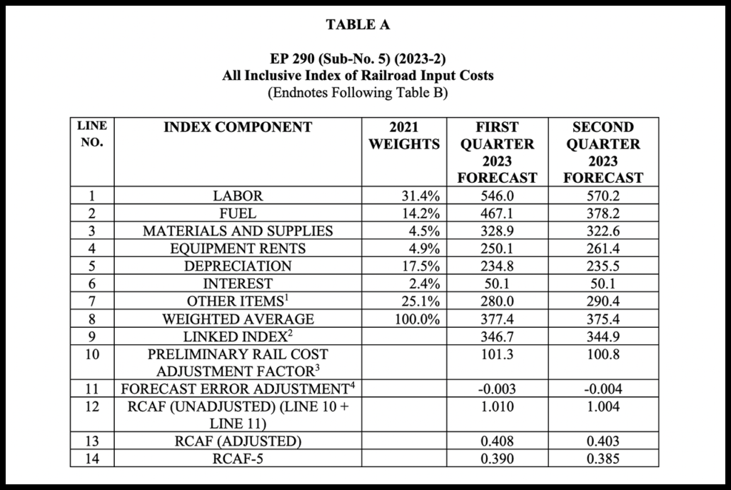 The Surface Transportation Board (STB) has adopted for second-quarter 2023 the rail cost adjustment factor (RCAF), defined as “an index formulated to represent changes in railroad costs incurred by the nation’s largest railroads over a specified period of time.”
