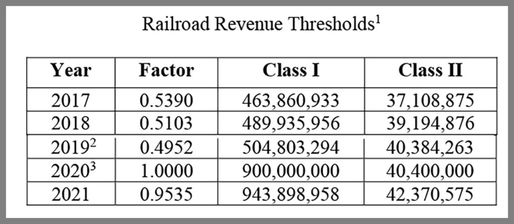 “The deflator factor is used by the railroads to adjust their gross annual operating revenues for classification purposes,” STB explained. “This indexing methodology ensures that railroads are classified based on real business expansion and not on the effects of inflation. Classification is important because it determines the extent to which individual railroads must comply with the Board’s reporting requirements.”