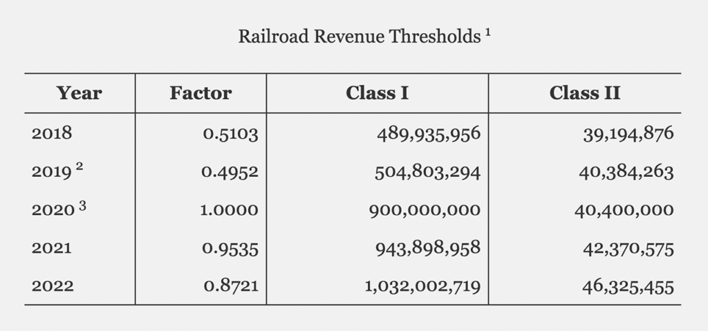 The Surface Transportation Board (STB) has published the annual deflator factor and inflation-adjusted railroad revenue thresholds for 2022.