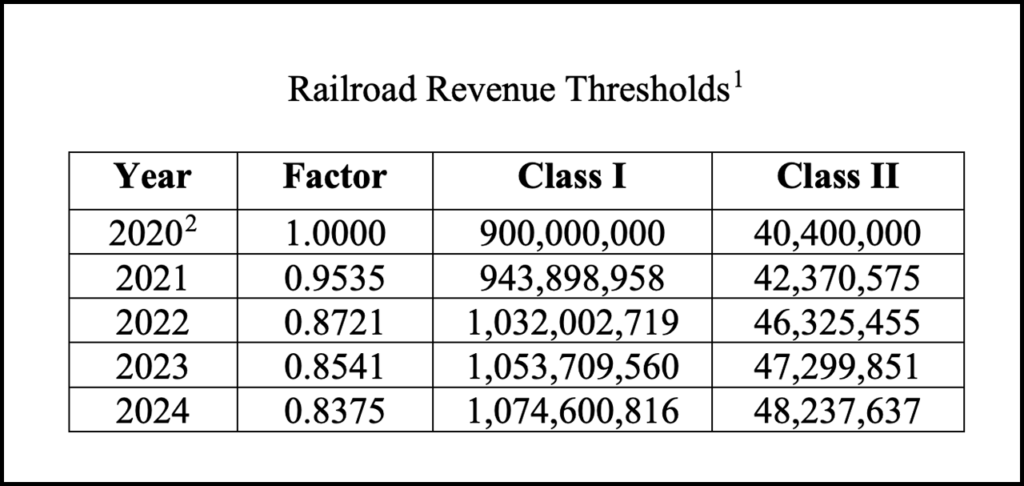 2. The 2020 and subsequent values are based on the thresholds established in Docket No. EP 763, and the deflator factor is indexed with a base year of 2019. As the PPI industry index for line-haul railroads remained the same from 2019 to 2020, the annual deflator factor for 2020 was 1.0000.