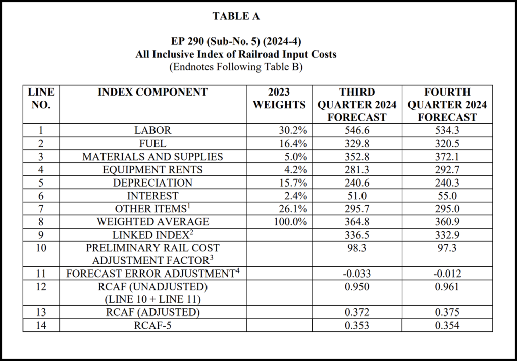 The Surface Transportation Board (STB) has adopted for fourth-quarter 2024 the rail cost adjustment factor (RCAF), which is defined as “an index formulated to represent changes in railroad costs incurred by the nation’s largest railroads over a specified period of time.”