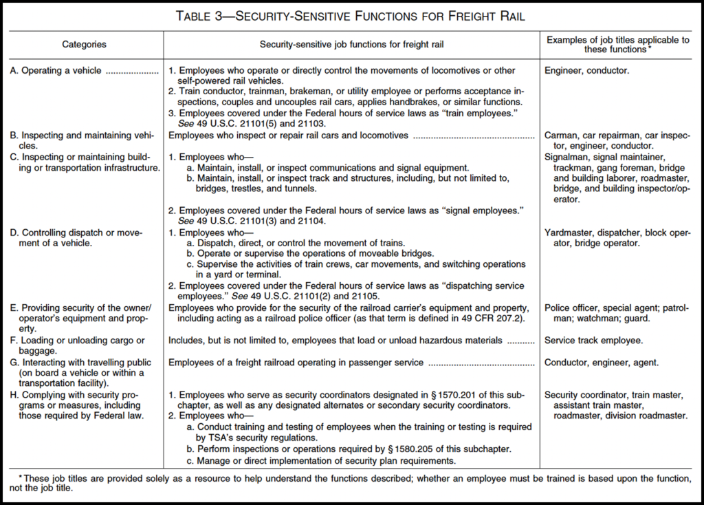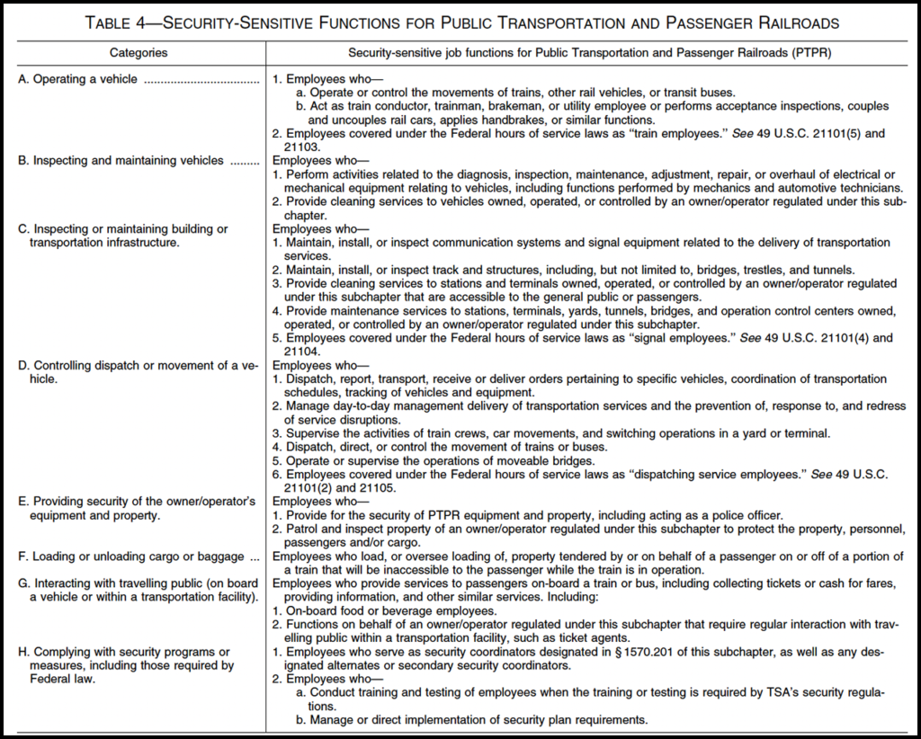 Frontline or security-sensitive public transportation or railroad employees (see charts below) would be required to undergo a “name-based security background check against the consolidated terrorist watchlist and an immigration check,” TSA reported in the May 23 edition of the Federal Register. Also, security coordinators of railroads and OTRBs would be required “to be U.S. citizens, unless TSA waives this requirement after an appropriate background check of the individual and a satisfactory review of the consolidated terrorist watchlist.”
