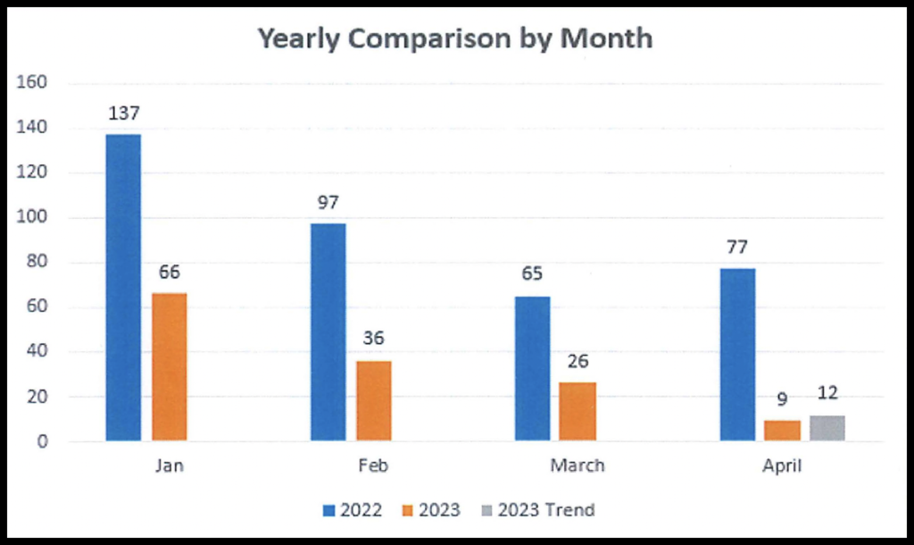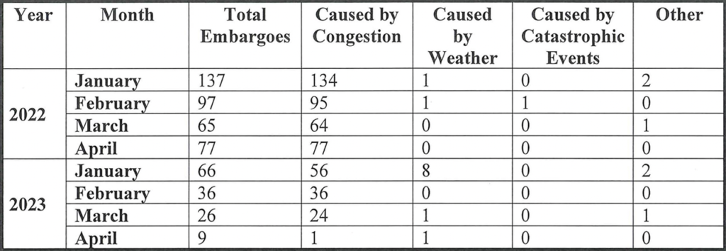 UP told the STB that technology and process improvements have “already yielded positive results, with over a 65% reduction in customer embargoes when comparing January through April year-over-year data [see charts below]. Further, while in 2022 approximately 29% of the customers notified of potential inventory issues ended in embargoes, the various enhancements in 2023 have reduced that embargo number to 14%.” The railroad noted that it is now averaging fewer than five embargoes per week, and in the last eight weeks, it has been averaging four per week.