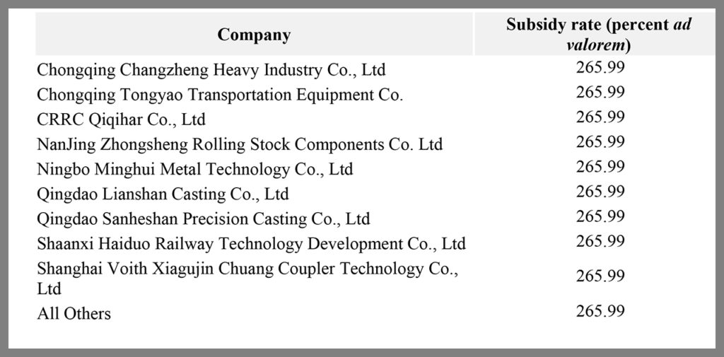 Based on “affirmative final determinations” by the U.S. Department of Commerce (USDOC) and the U.S. International Trade Commission (USITC), USDOC issued on July 14 a CVD (countervailing duty) order and Anti-Dumping Duty order on certain freight rail couplers and components produced in the People’s Republic of China.