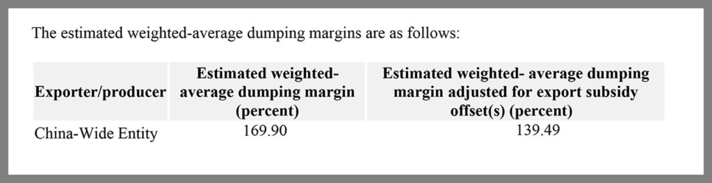 USDOC said it also intends “to instruct USCBP to require cash deposits equal to the amounts as indicated [in the chart above] … Accordingly … CBP will require, at the same time as importers would deposit estimated normal customs duties on the subject merchandise, a cash deposit for each entry of subject merchandise equal to the subsidy rates listed [above]. The all-others rate applies to all producers or exporters not specifically listed [above], as appropriate.”