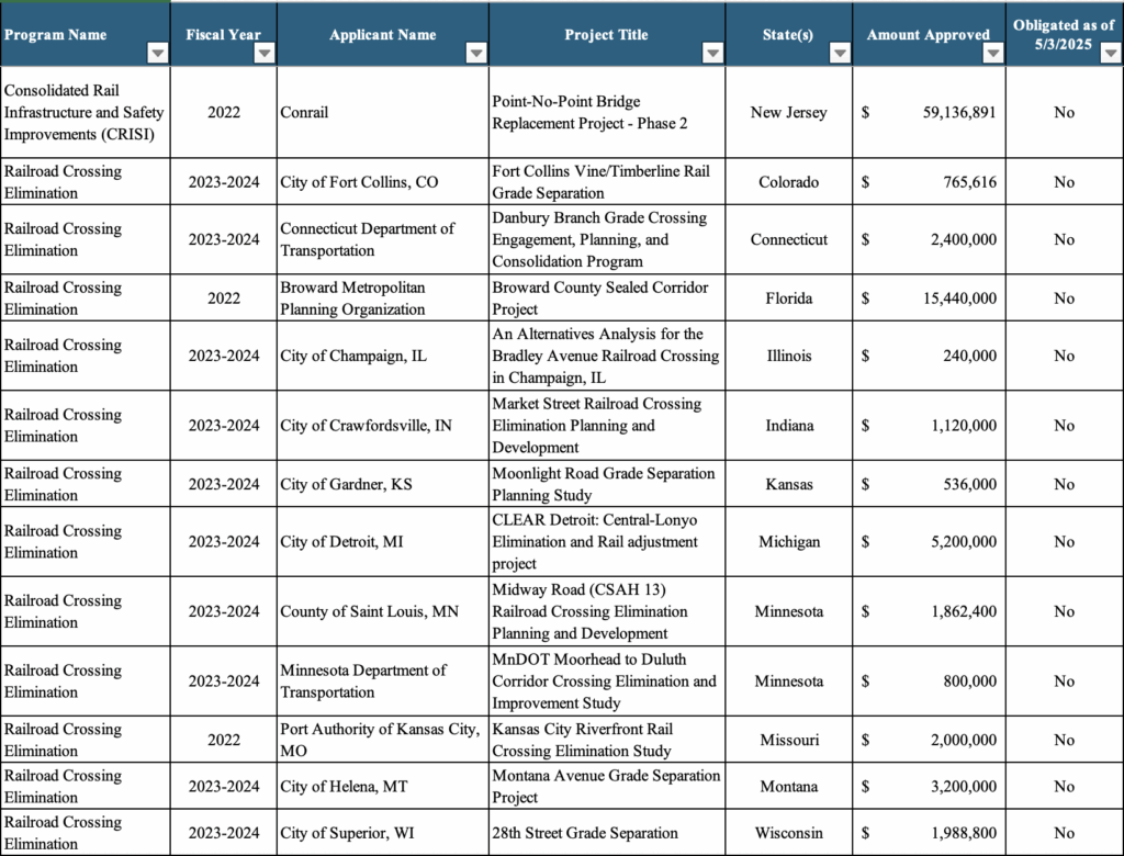 Following is a detailed breakdown of the 13 rail-related projects that will now receive grants through the FRA: