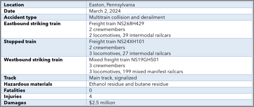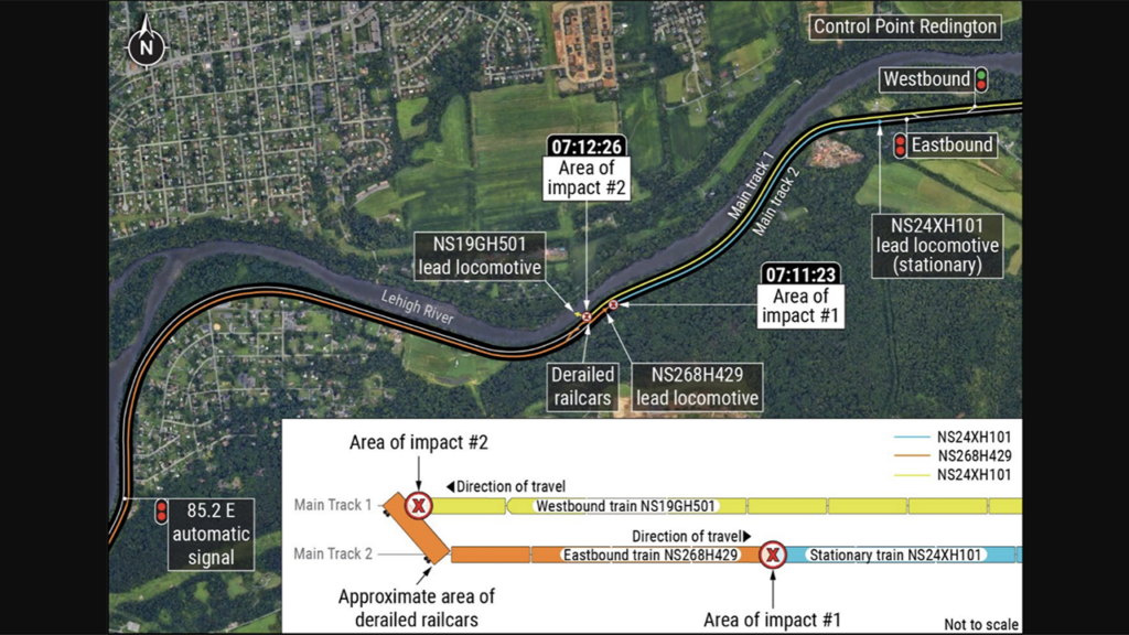 On March 2, 2024, about 7:11 a.m., eastbound NS intermodal train NS268H429 collided with the rear of stationary NS intermodal train NS24XH101 on main track 2 on the Allentown Road Subdivision on the Lehigh Line near Easton, (see figure above), according to the report that was issued April 10 (download below). “As a result of the first collision, train NS268H429 derailed three railcars that then fouled the adjacent main track 1,” the NTSB said. “Just over one minute later, a second collision occurred when train NS19GH501 struck the derailed equipment while traveling westbound on main track 1. As a result of the second collision, train NS19GH501 derailed six railcars and two locomotives. Three of the six derailed railcars were placarded as hazardous materials tank cars: one containing ethanol residue and two containing butane residue. The tank cars did not breach or release hazardous materials. The two derailed locomotives partially submerged in the Lehigh River and discharged locomotive diesel fuel into the water … Four crewmembers from the accident trains were transported to a local hospital, treated for minor injuries, and released.” At the time of the collisions, the NTSB noted, visibility conditions were daylight and overcast; the weather was 35°F with light rain.
