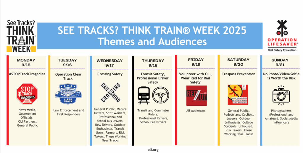 From Sept. 15-21, See Tracks? Think Train® Week will focus on a different theme each day as highlighted in the graphic below.