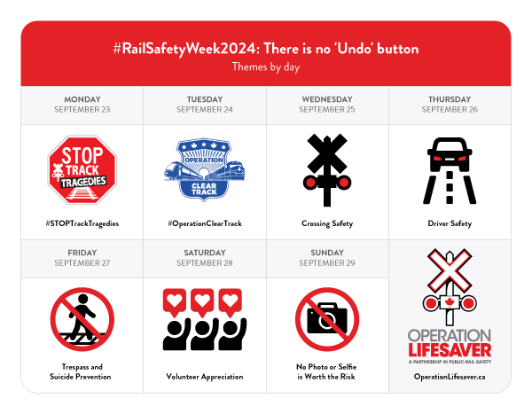 The schedule for Operation Lifesaver Canada’s 2024 Rail Safety Week can be found below.
