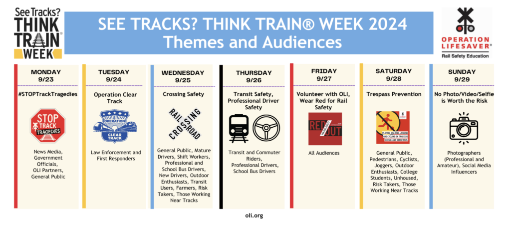 See Tracks? Think Train® Week in the U.S. is emphasizing a different theme (see below) each day and featuring in-person events led by state Operation Lifesaver programs, as well as virtual activities and social media efforts.