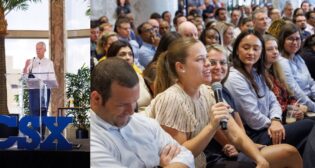 CSX President and CEO Steve Angel hosts a town hall to connect with employees. Also, CSX introduces the Badger Overland Commander Trailer; and BNSF congratulates Tristar Transload, Inc., on the official opening of its Muscat Spur Terminal.