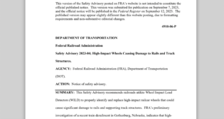 The Federal Railroad Administration (FRA) on Sept. 7 issued Safety Advisory 2023-04 recommending that railroads use Wheel Impact Load Detectors (WILD) “to properly identify and replace high-impact railcar wheels that could cause significant damage to rails and supporting track structures.”